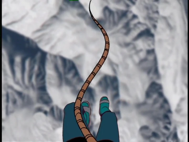 Race and the kids take a helicopter out and set down near where the avalanche was, but they can't find any trace of Dr. Quest or the expedition. With a storm coming, they continue on to Khumbu Monastery, all four tethered by a rope.